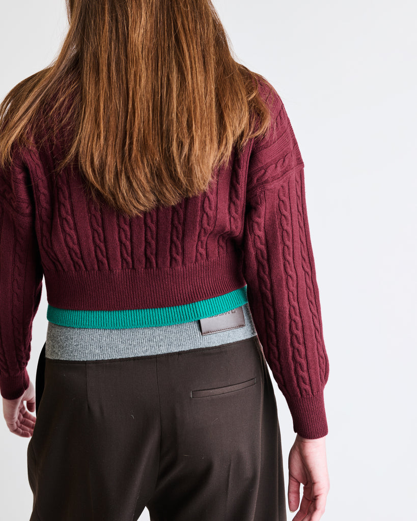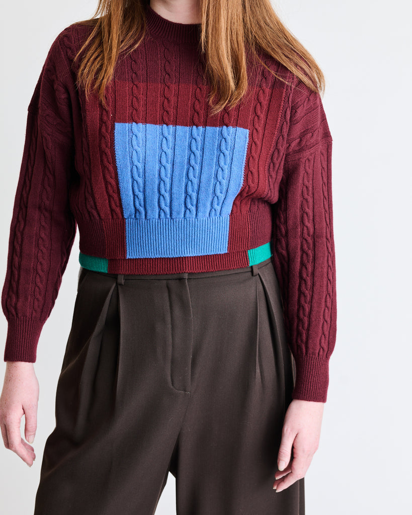 Sweater in medium-weight textured wool featuring placed intarsia squares inspired by Josef Albers's "Homage to the Square" series and a double layer hem.
