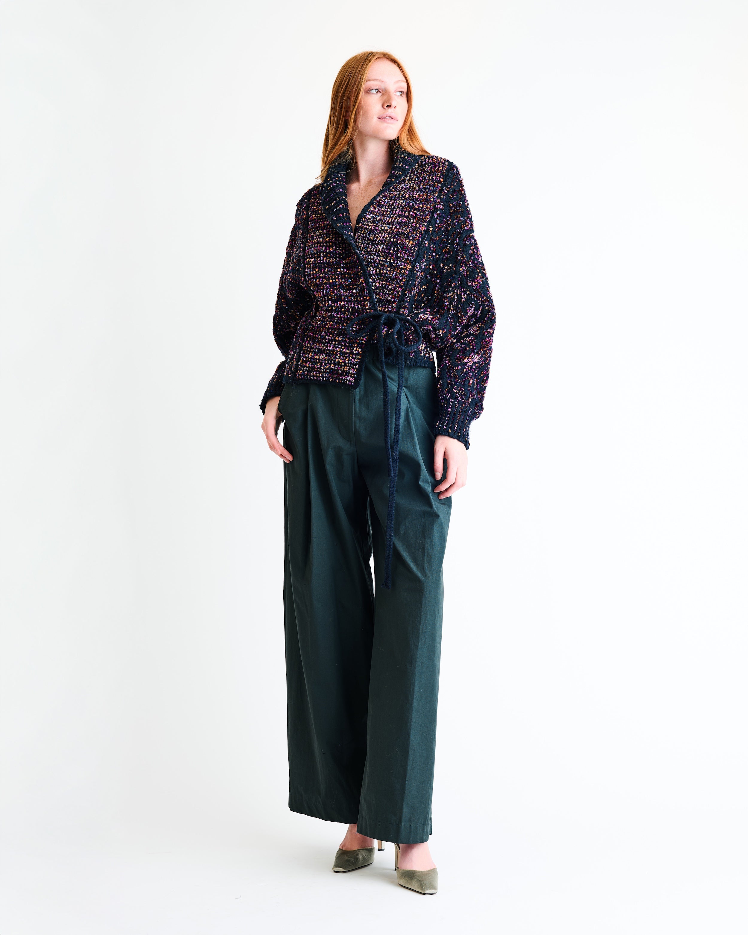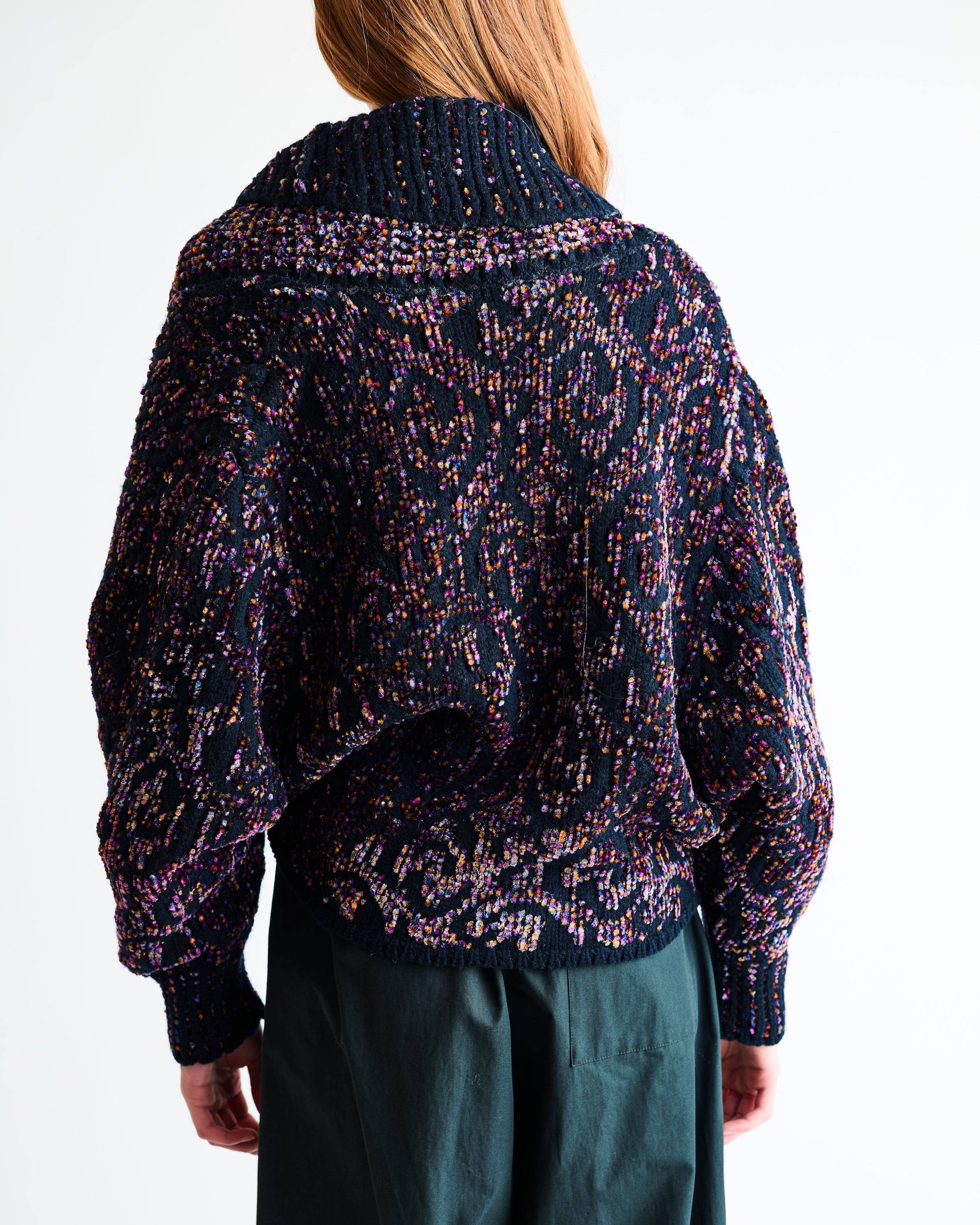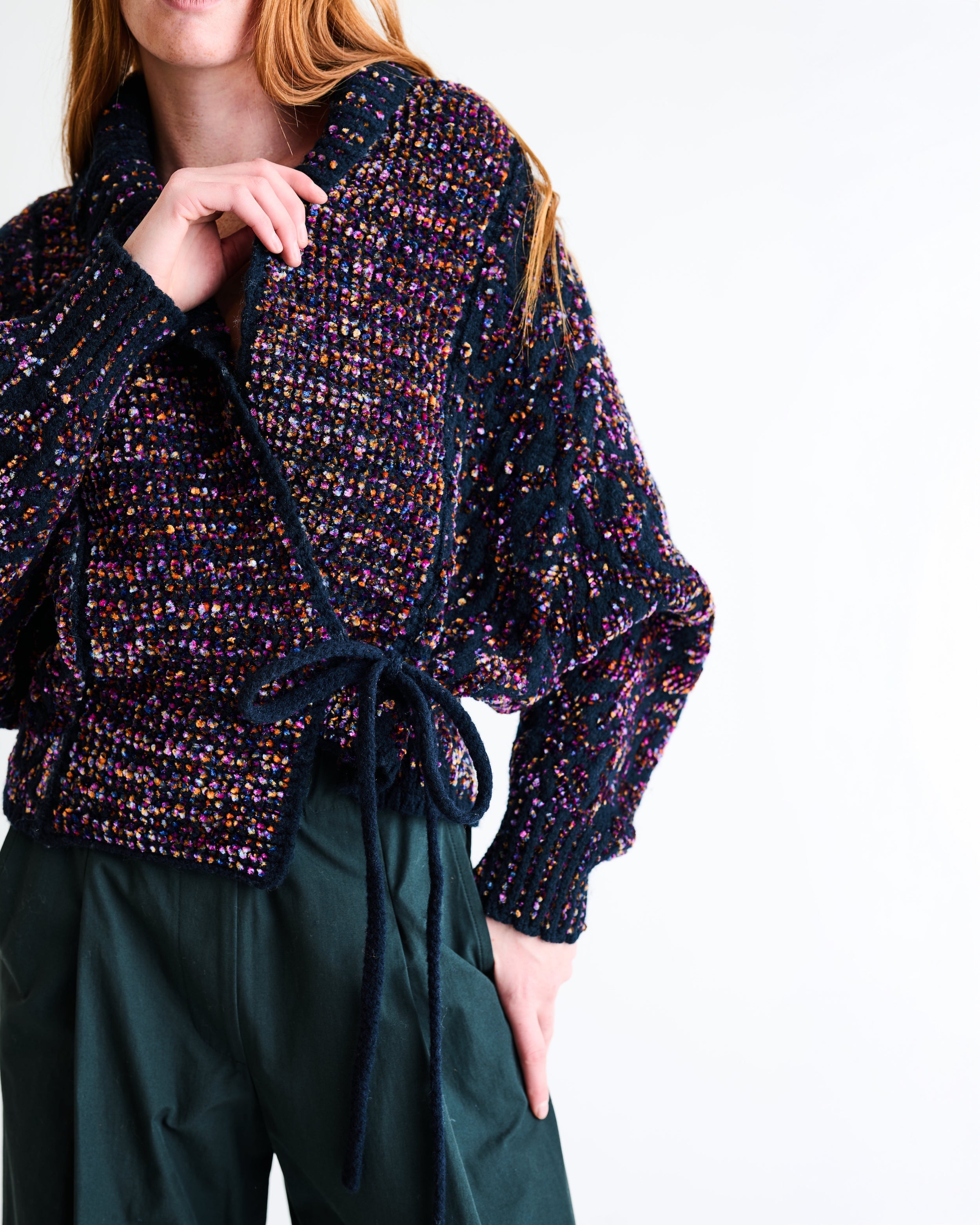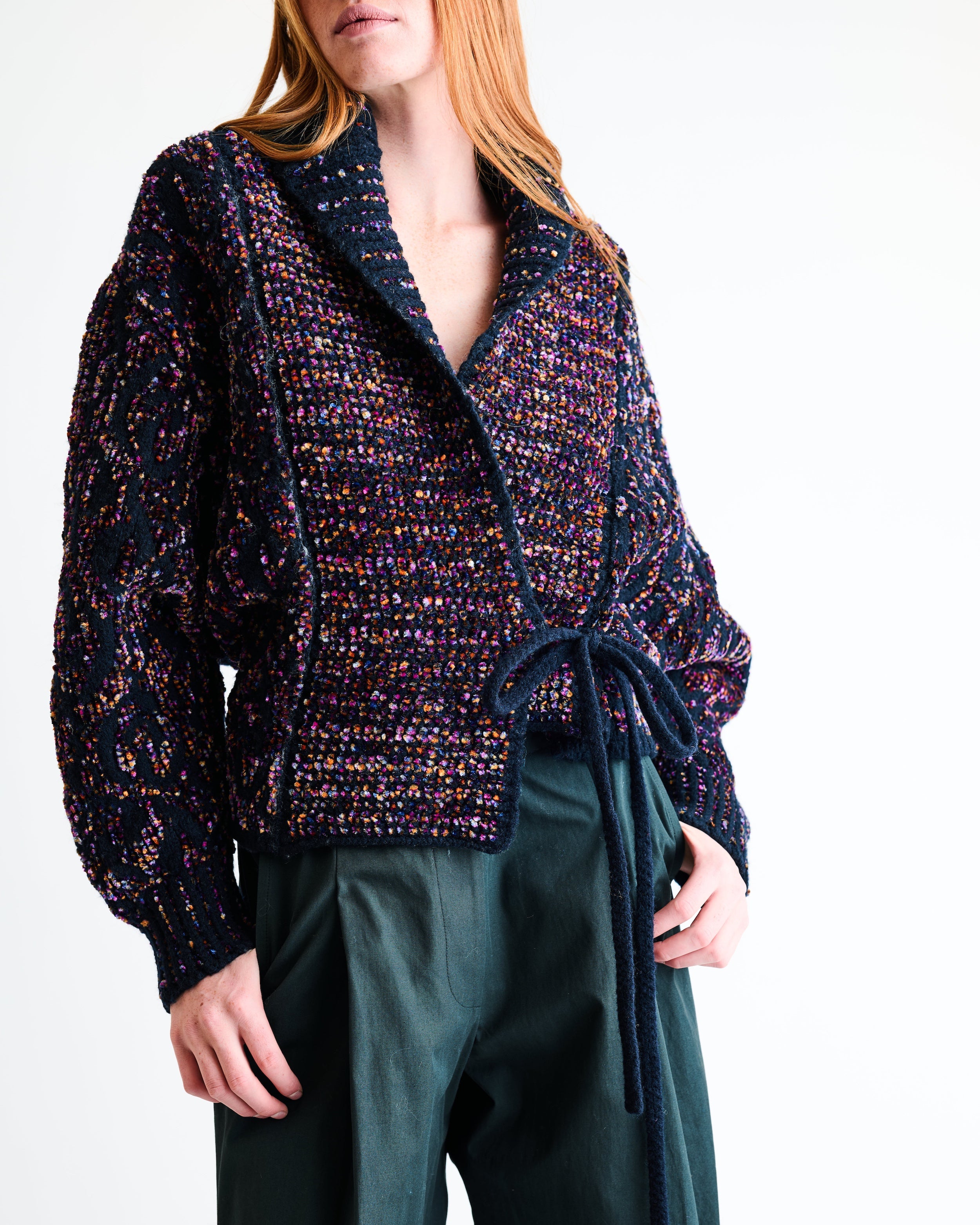 Loose fit sweater with wrap tie closure, in graphic wool jacquard. (2734)