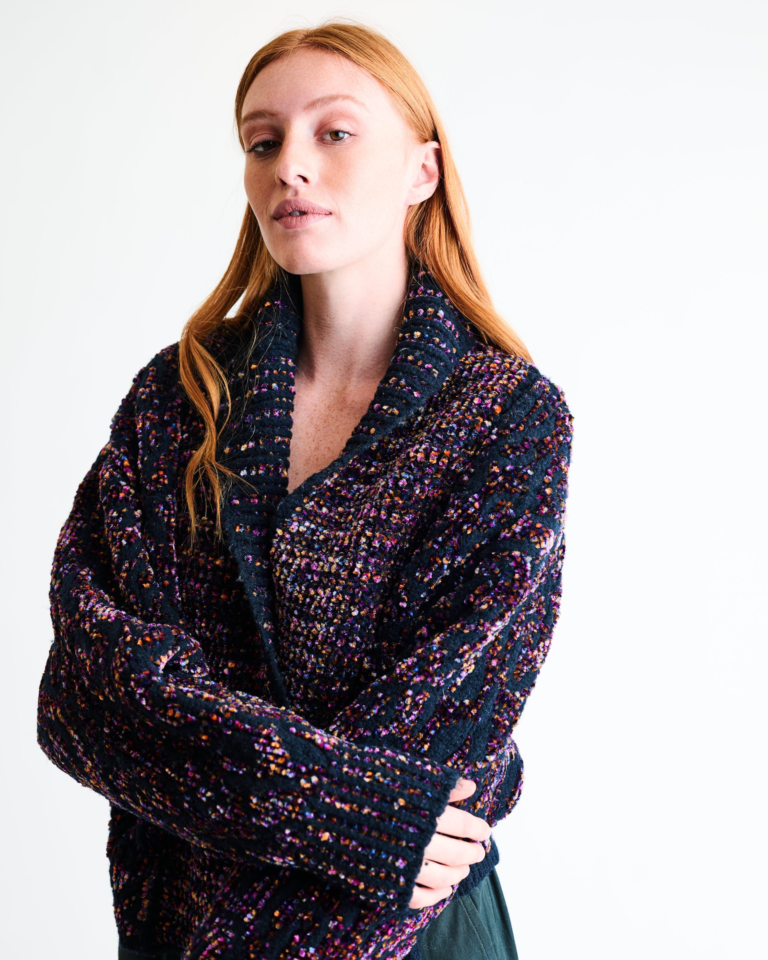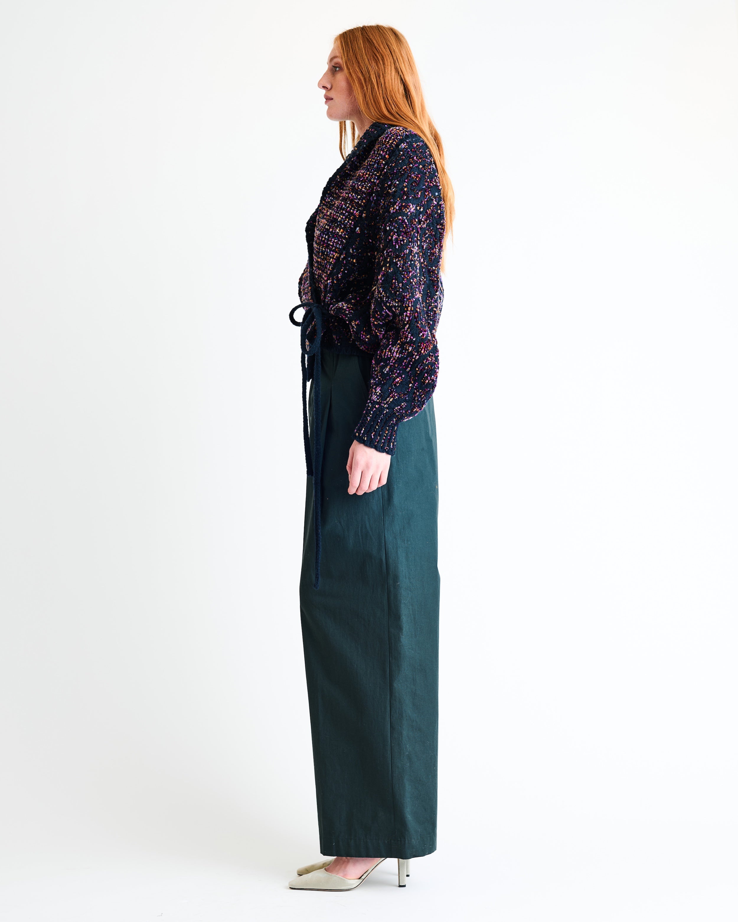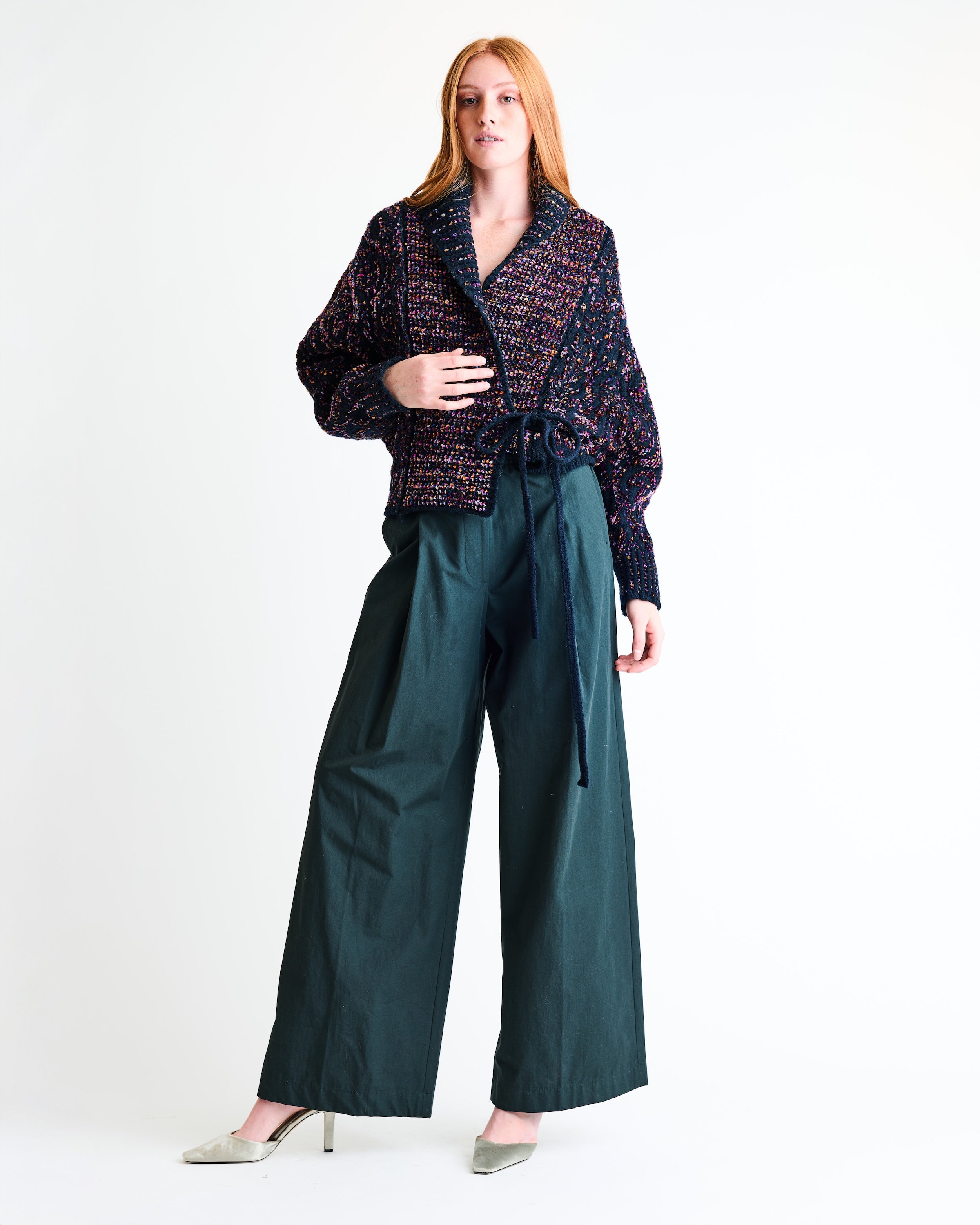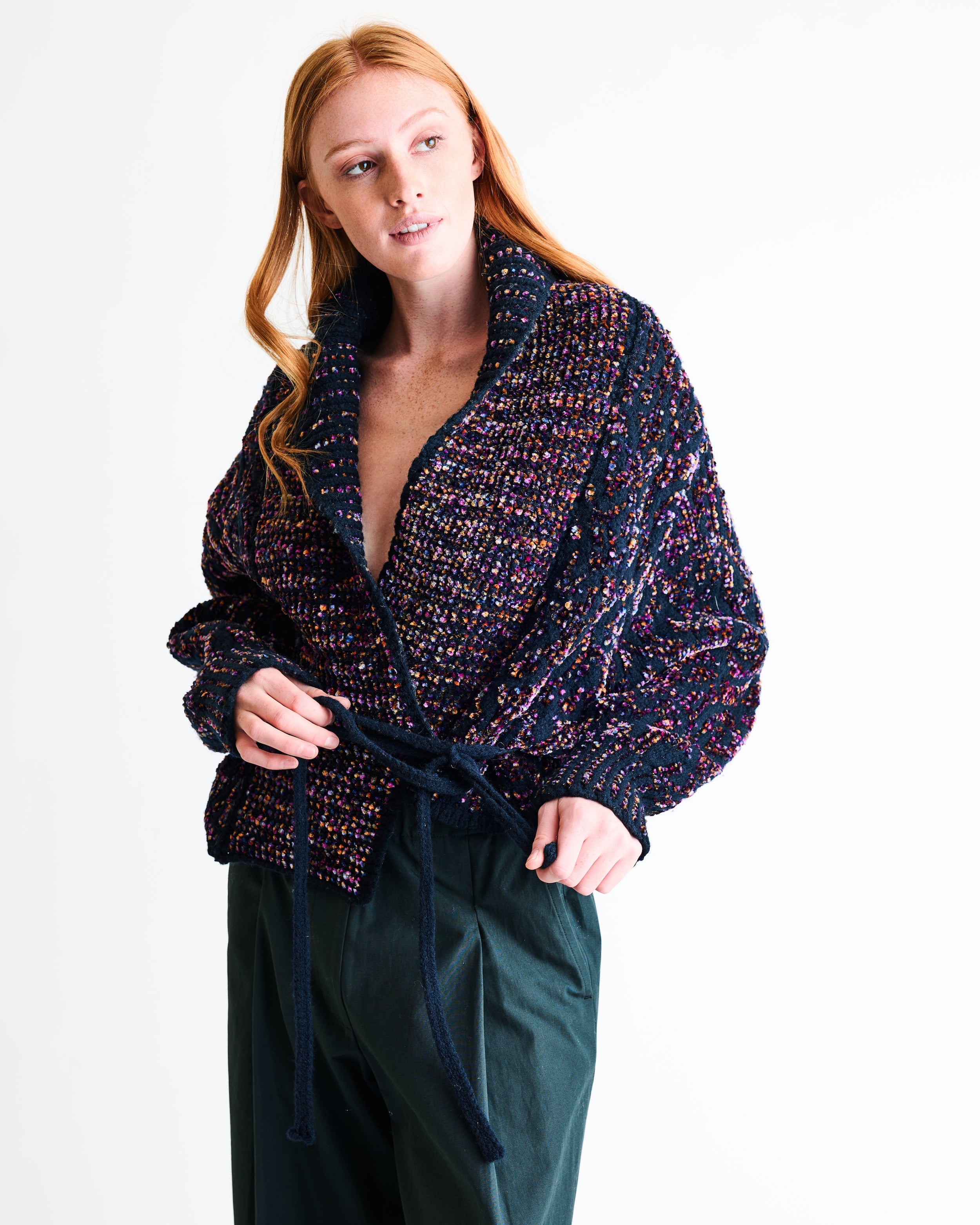 Loose fit sweater with wrap tie closure, in graphic wool jacquard. (2734)