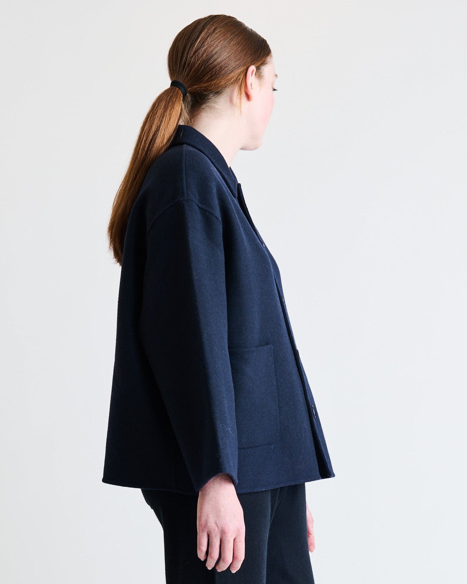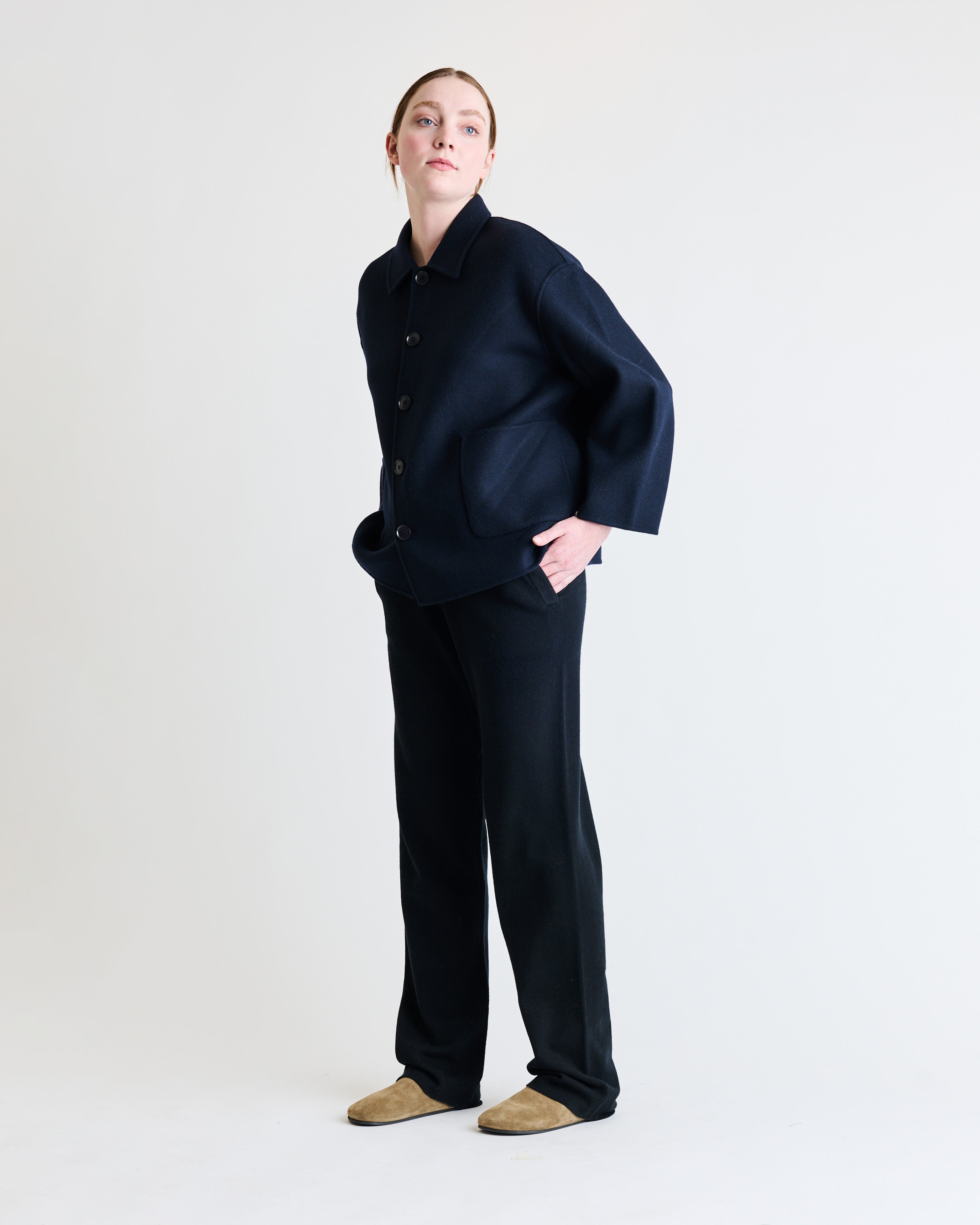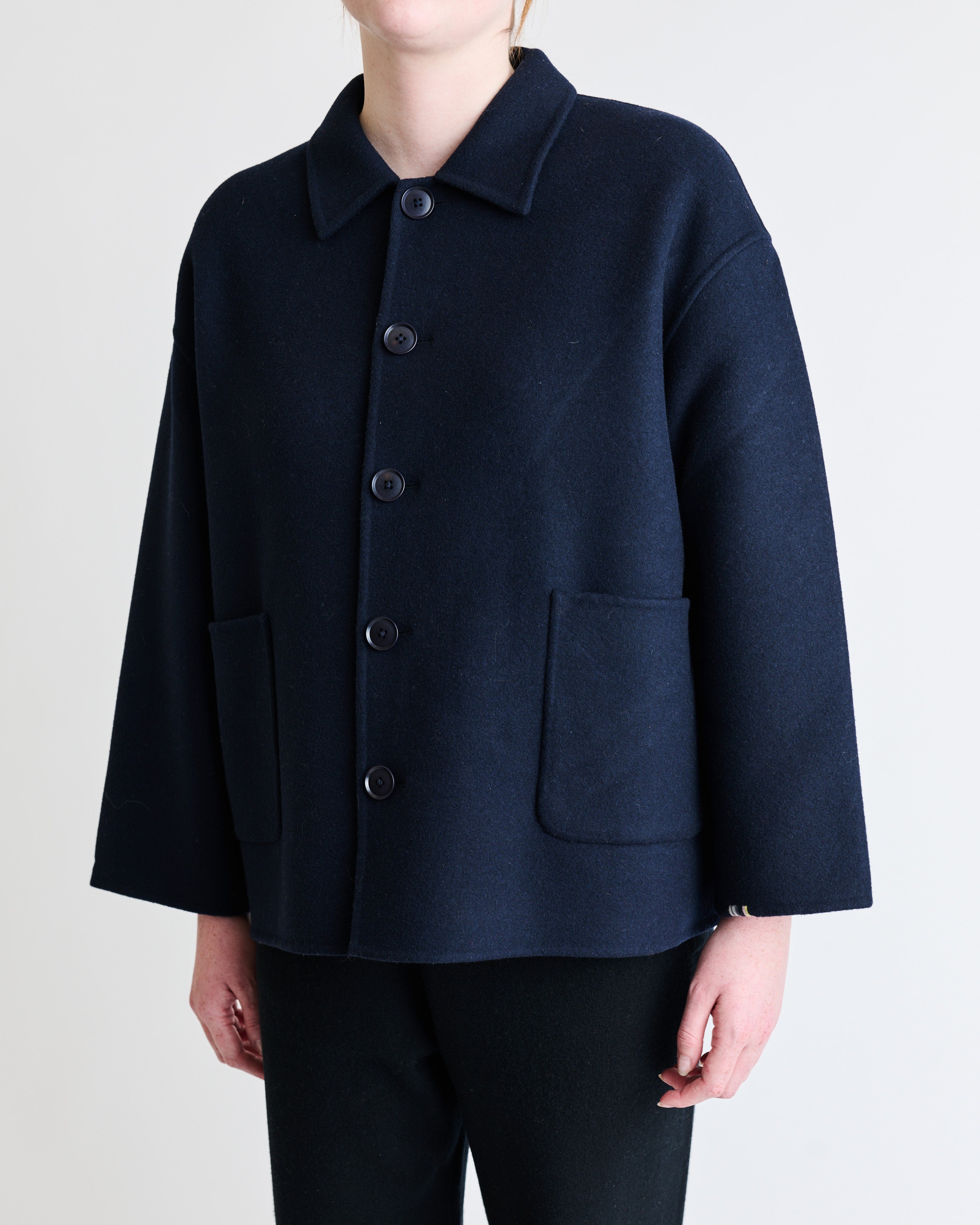 A boxy chore jacket, softened here in double-faced cashmere. It features two patch pockets, a pointed collar and five buttons in corozo – an all-natural, chemical-free material derived from the seed of a palm tree.