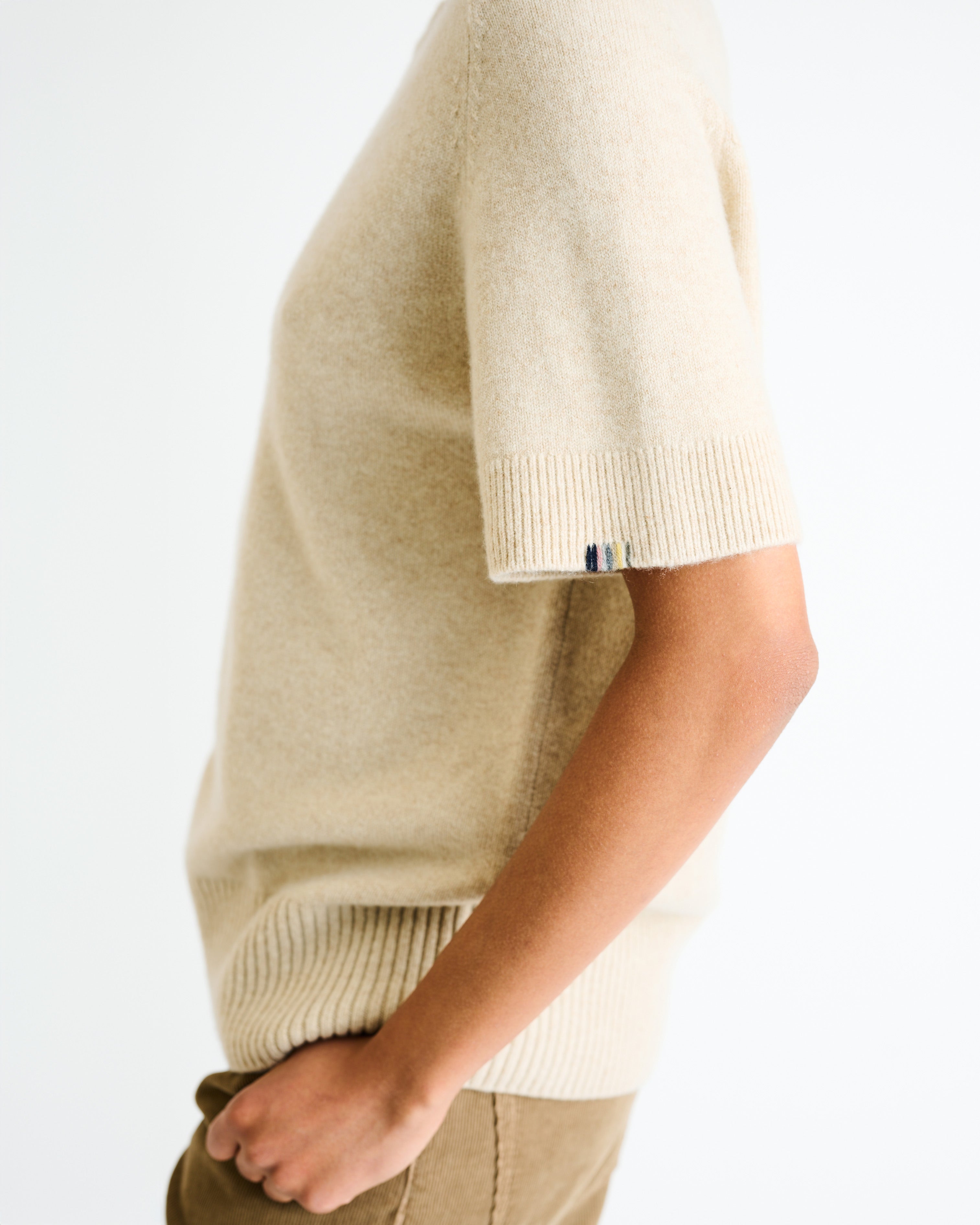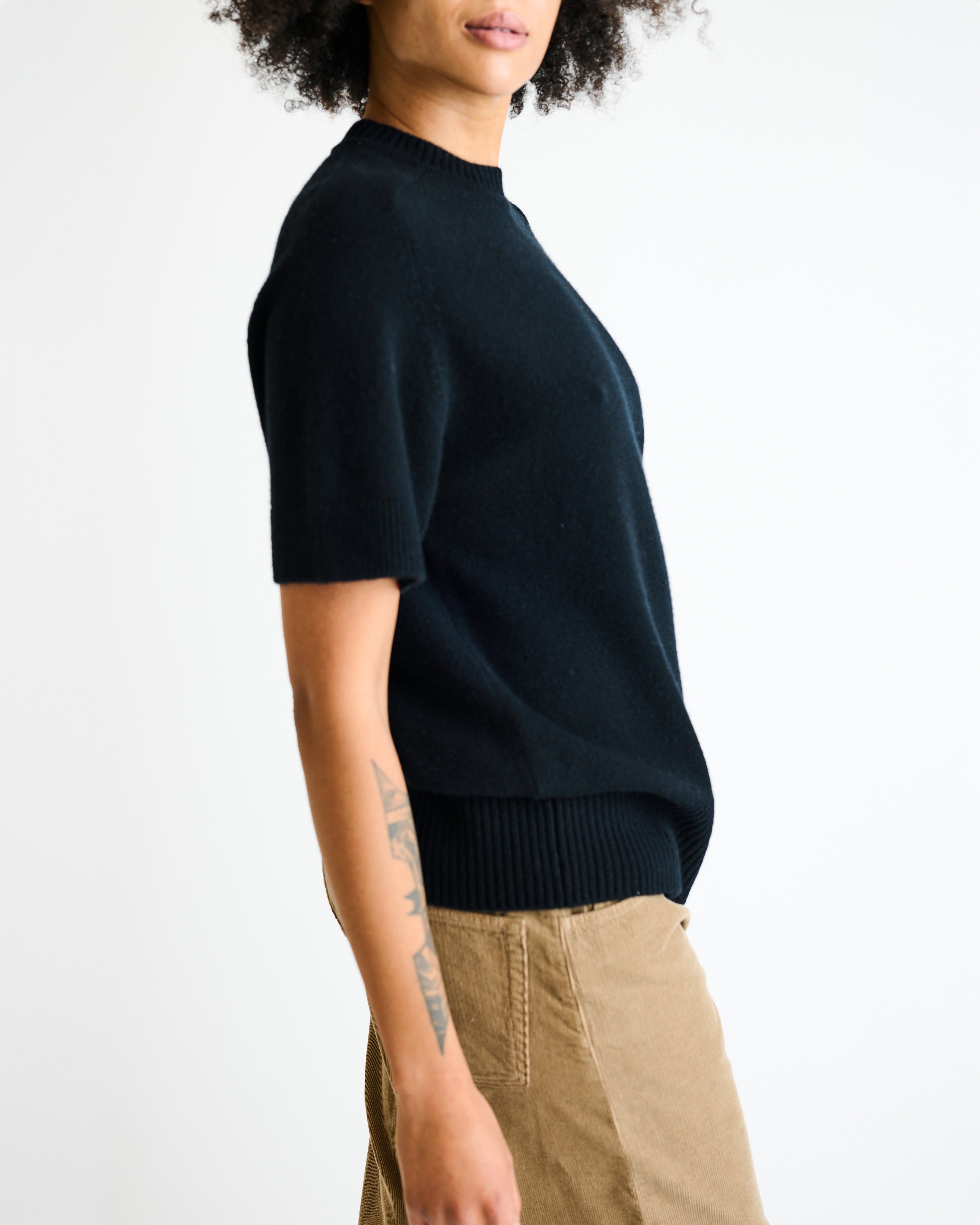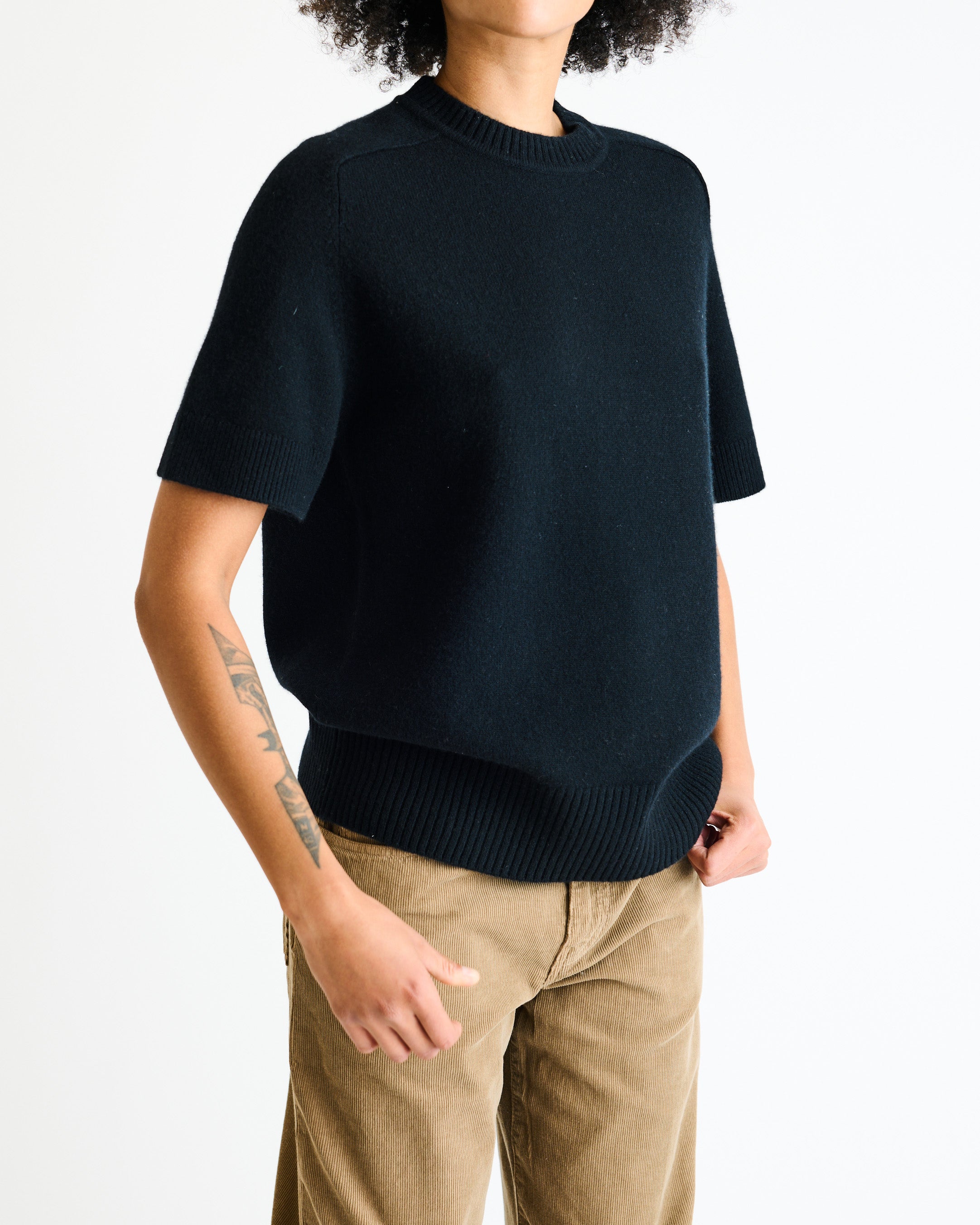 A short-sleeved cashmere sweater with rib-knit details at the neck, hem and cuffs. The short sleeves offer a modern twist on a classic design.