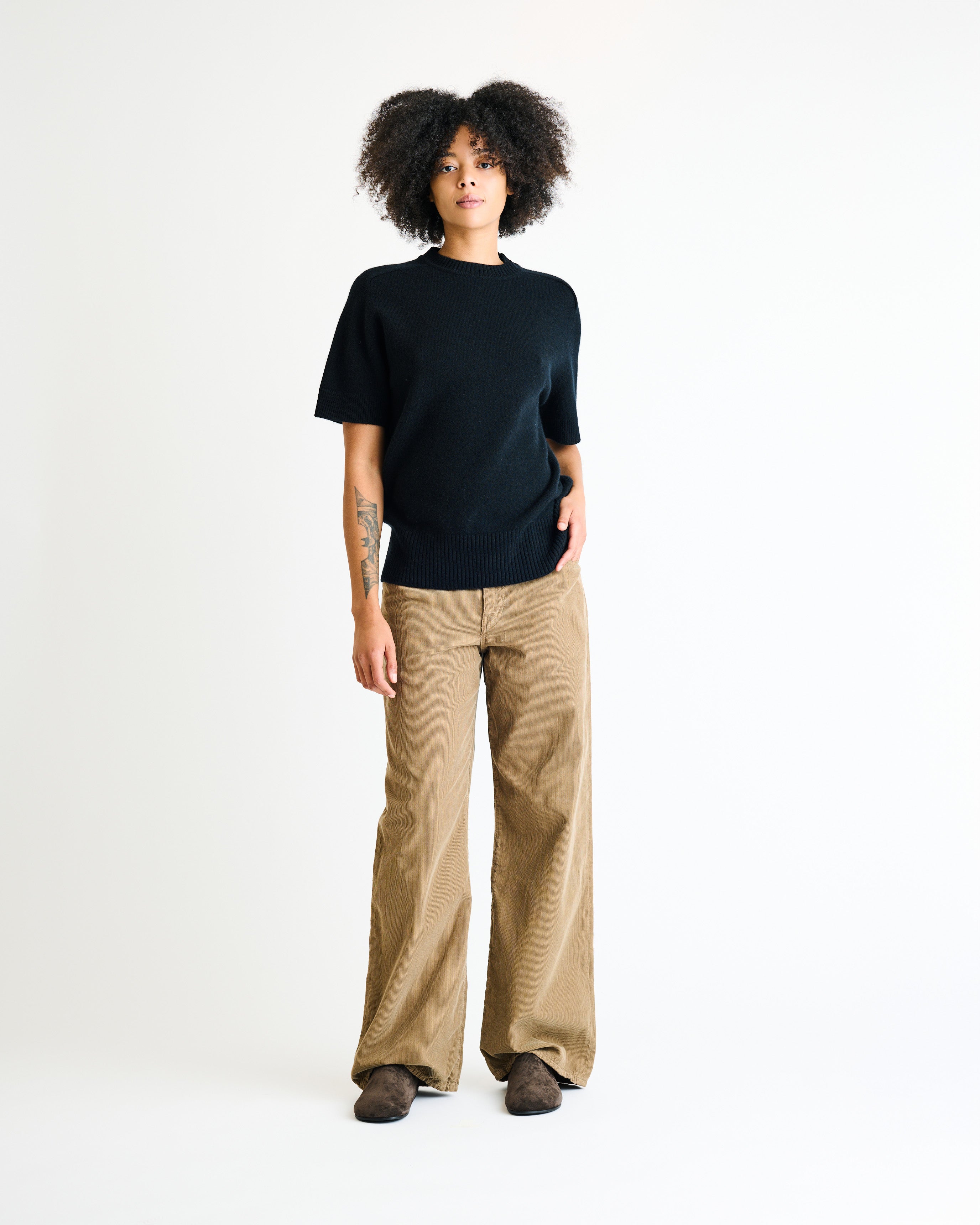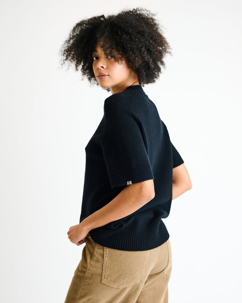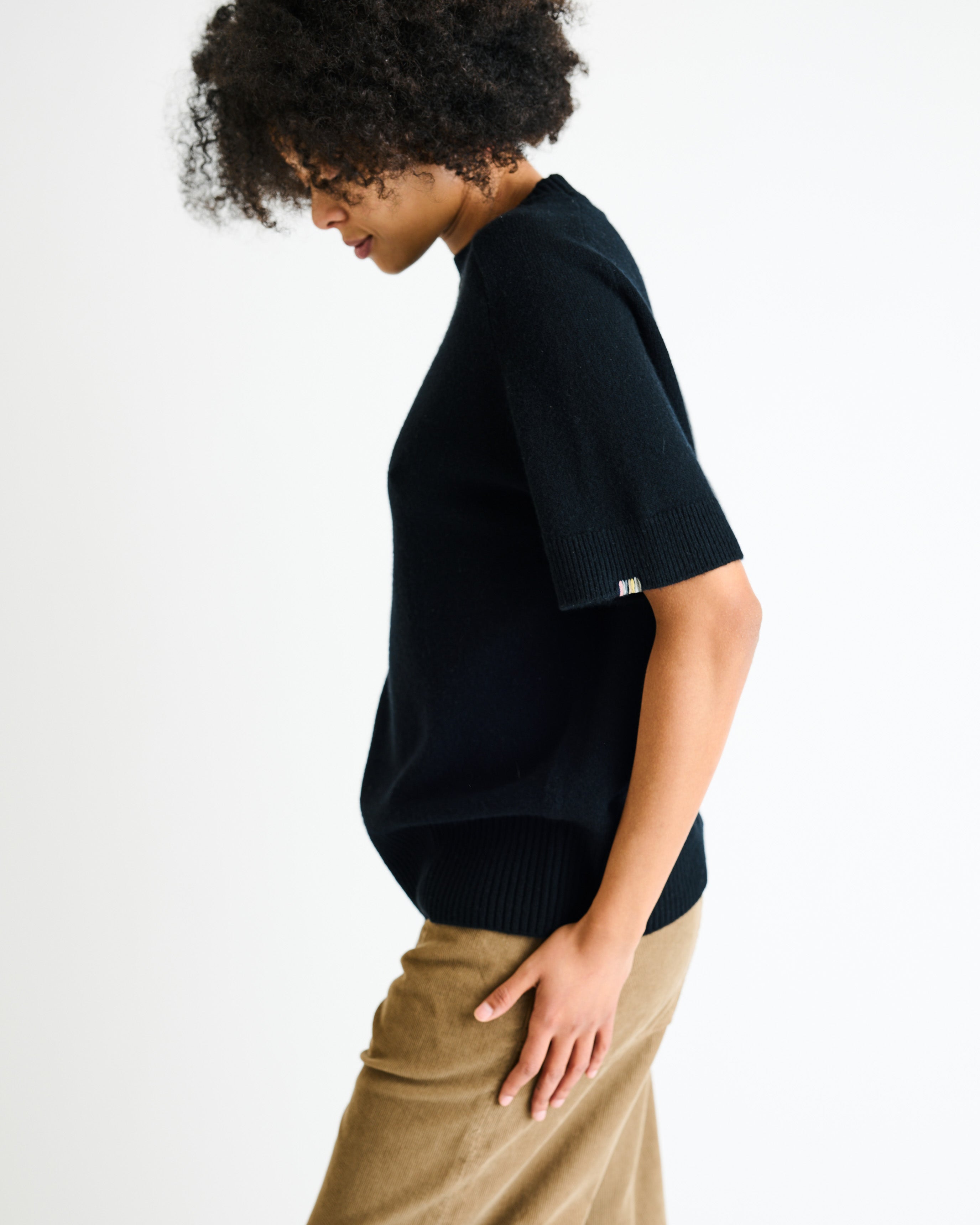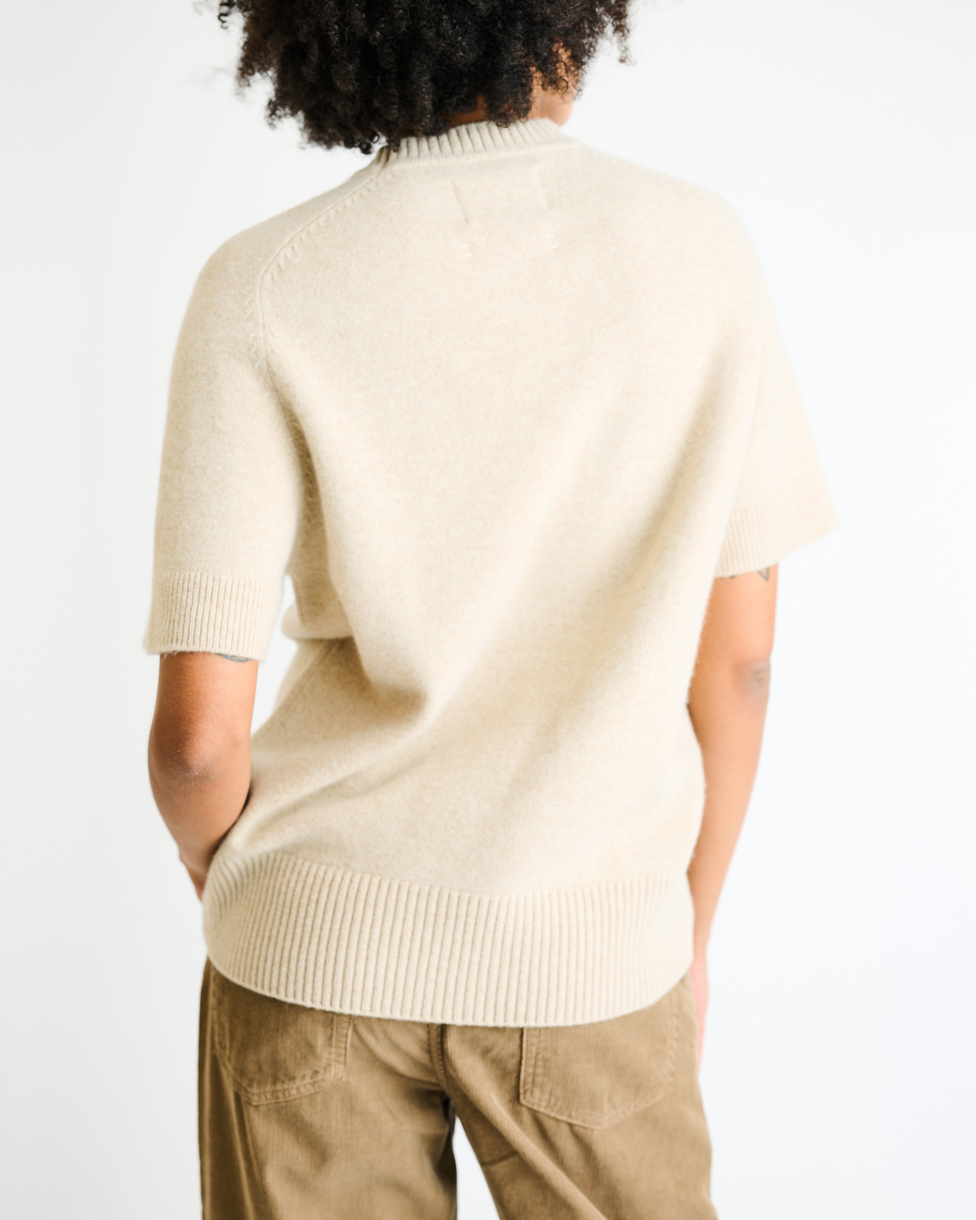 A short-sleeved cashmere sweater with rib-knit details at the neck, hem and cuffs. The short sleeves offer a modern twist on a classic design.