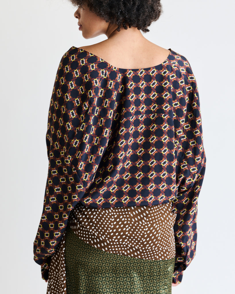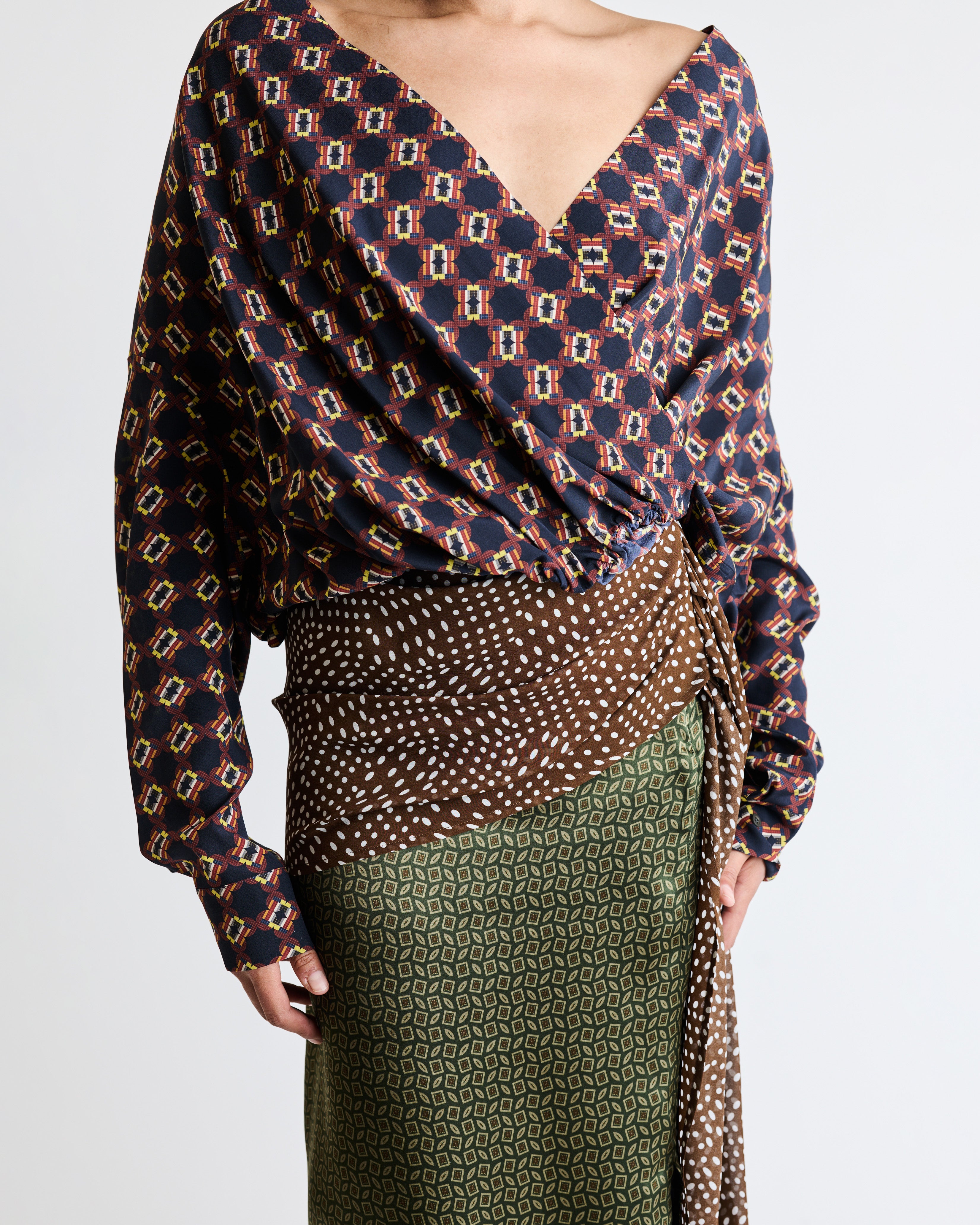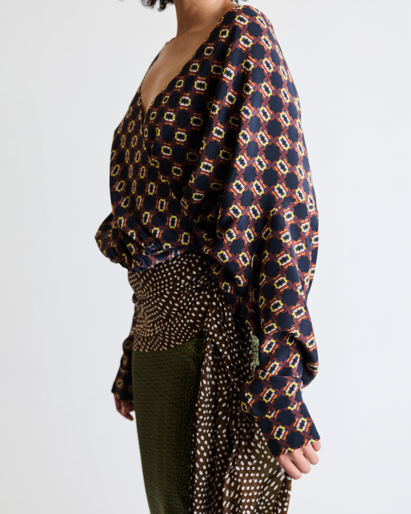 Loose fit top with draped front in silk, with Tie print and Argyle pattern. (2072)