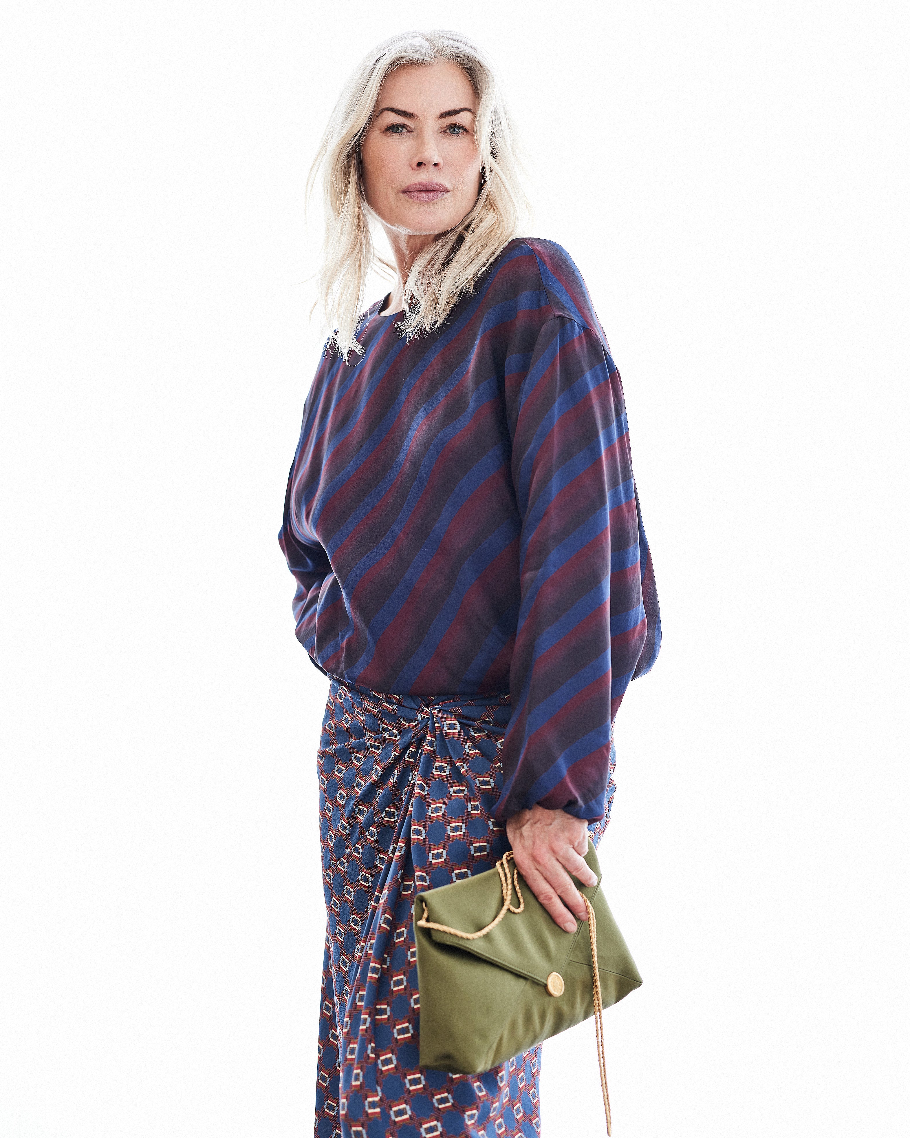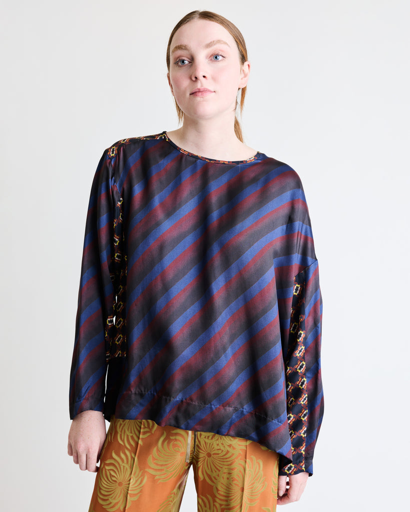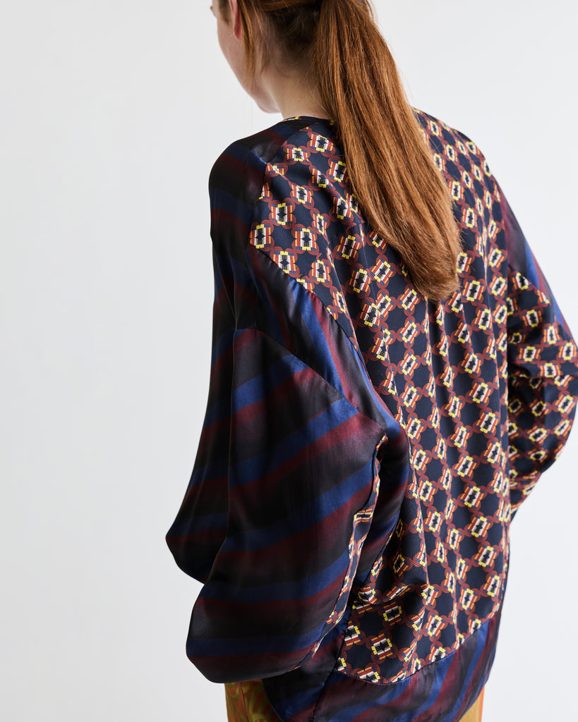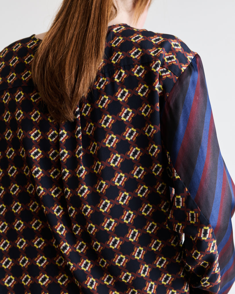 Loose fit asymmetrical top in silk habotai, with contrast panels, Tie print and Argyle pattern. (2256)