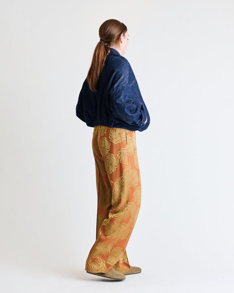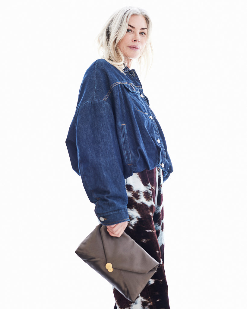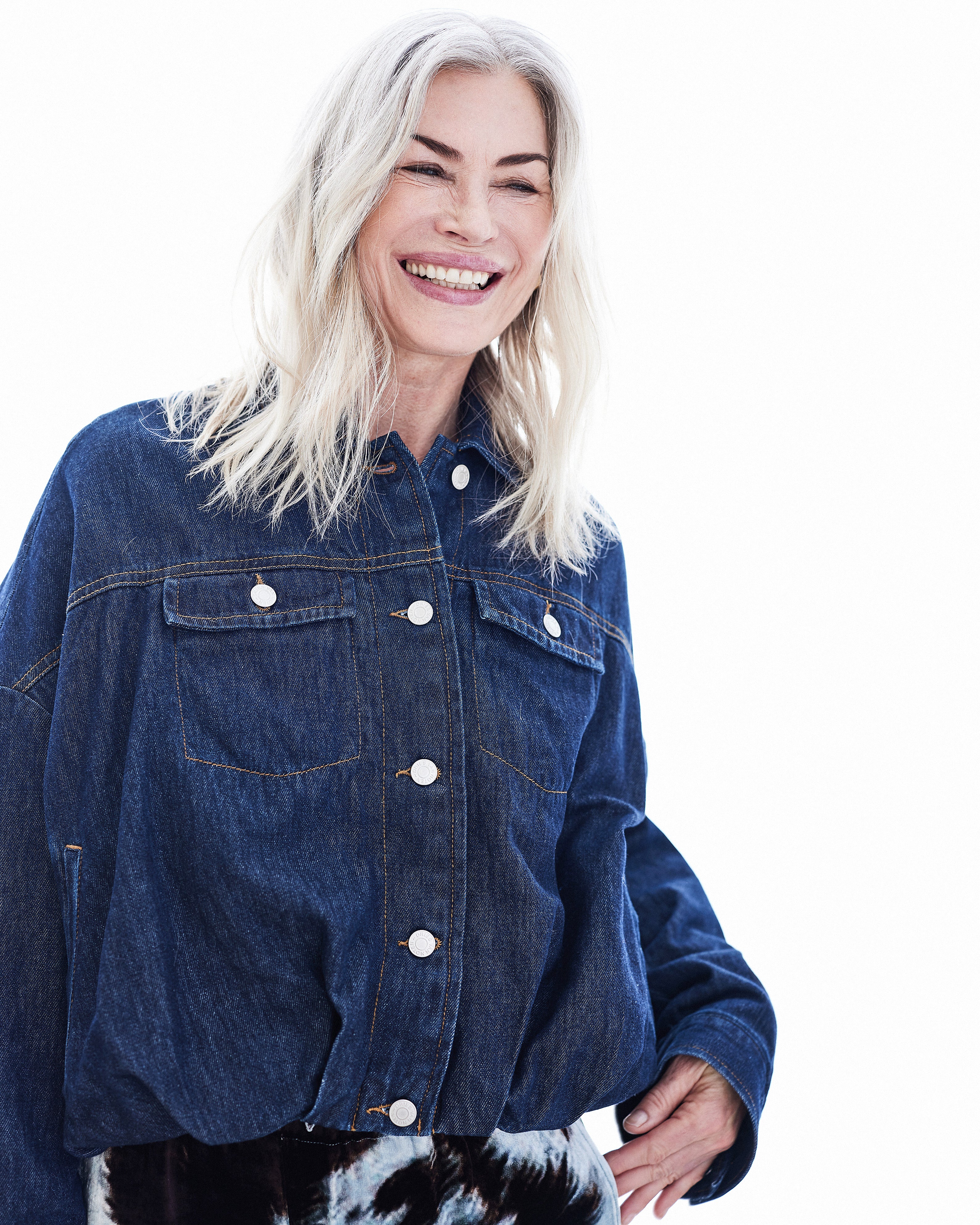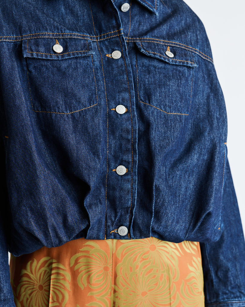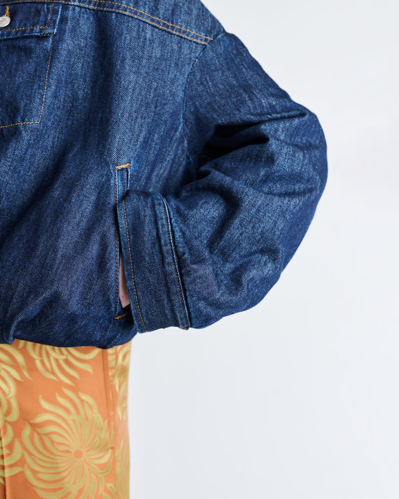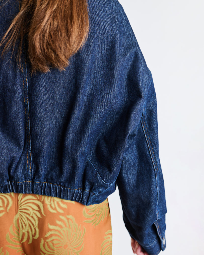 Cocoon shaped blouson in denim with front patch pockets and side slit pockets. (2381)